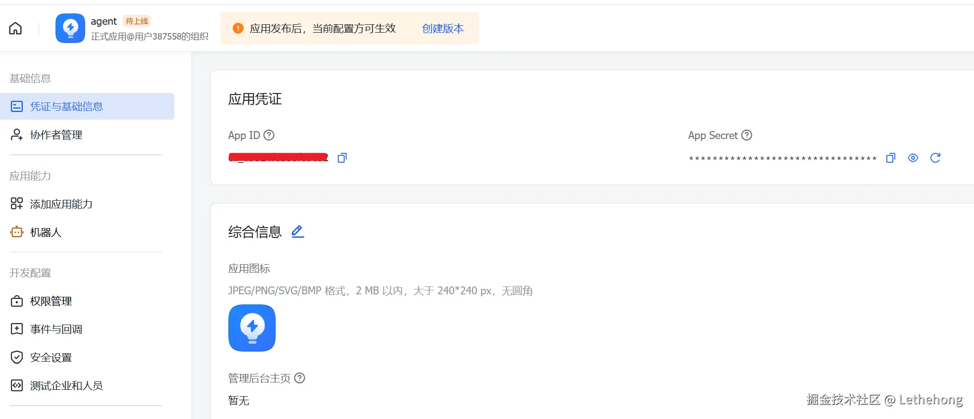 - 在「凭证与基础信息」中复制 App ID 和 App Secret。