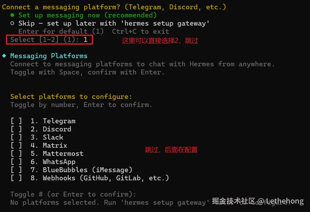 让 Agent 藏于终端是保守的做法,将它接入飞书,才是释放其 24/7 潜能的关键。新开一个 PowerShell 窗口,输入 hermes gateway setup 并选择 11(飞书配置),我们将进行一次精细的外部神经连接。