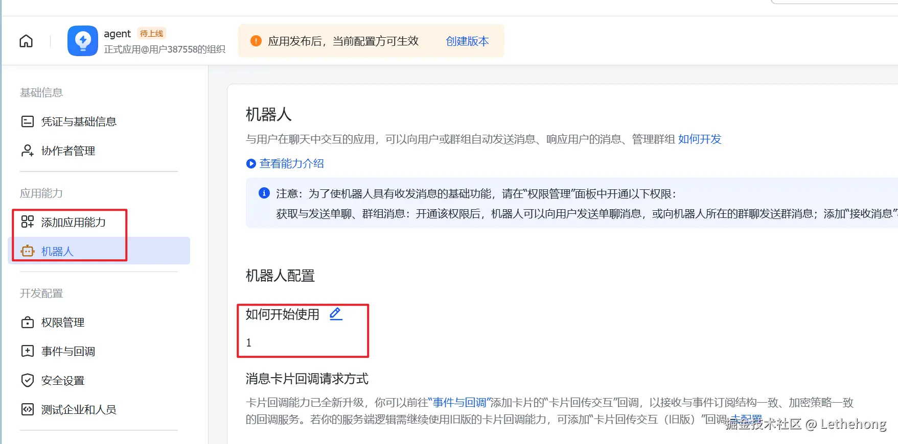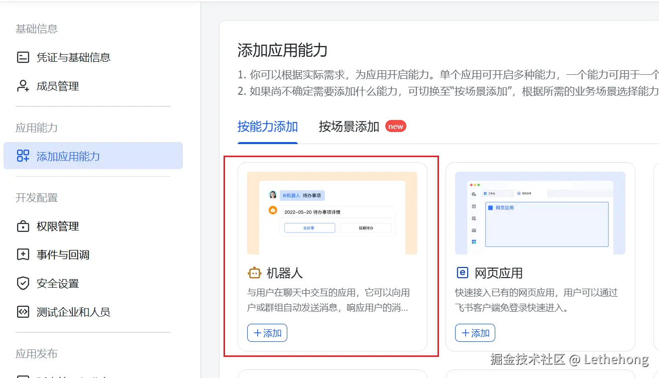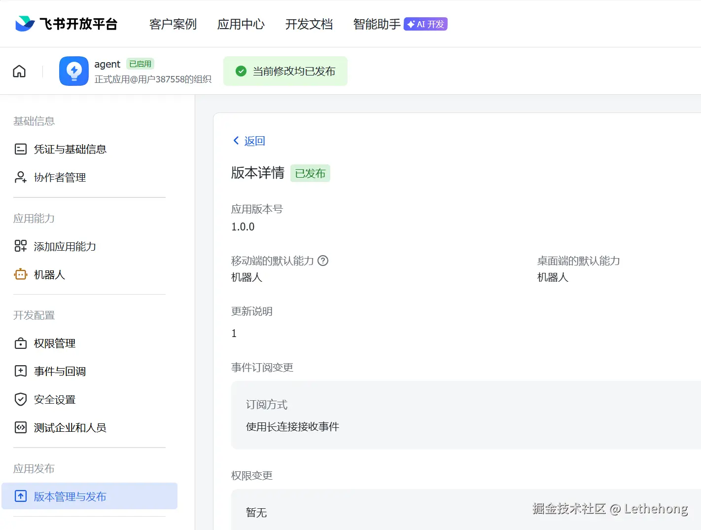 添加事件:至少包含 im.message.receive_v1(接收消息)。
