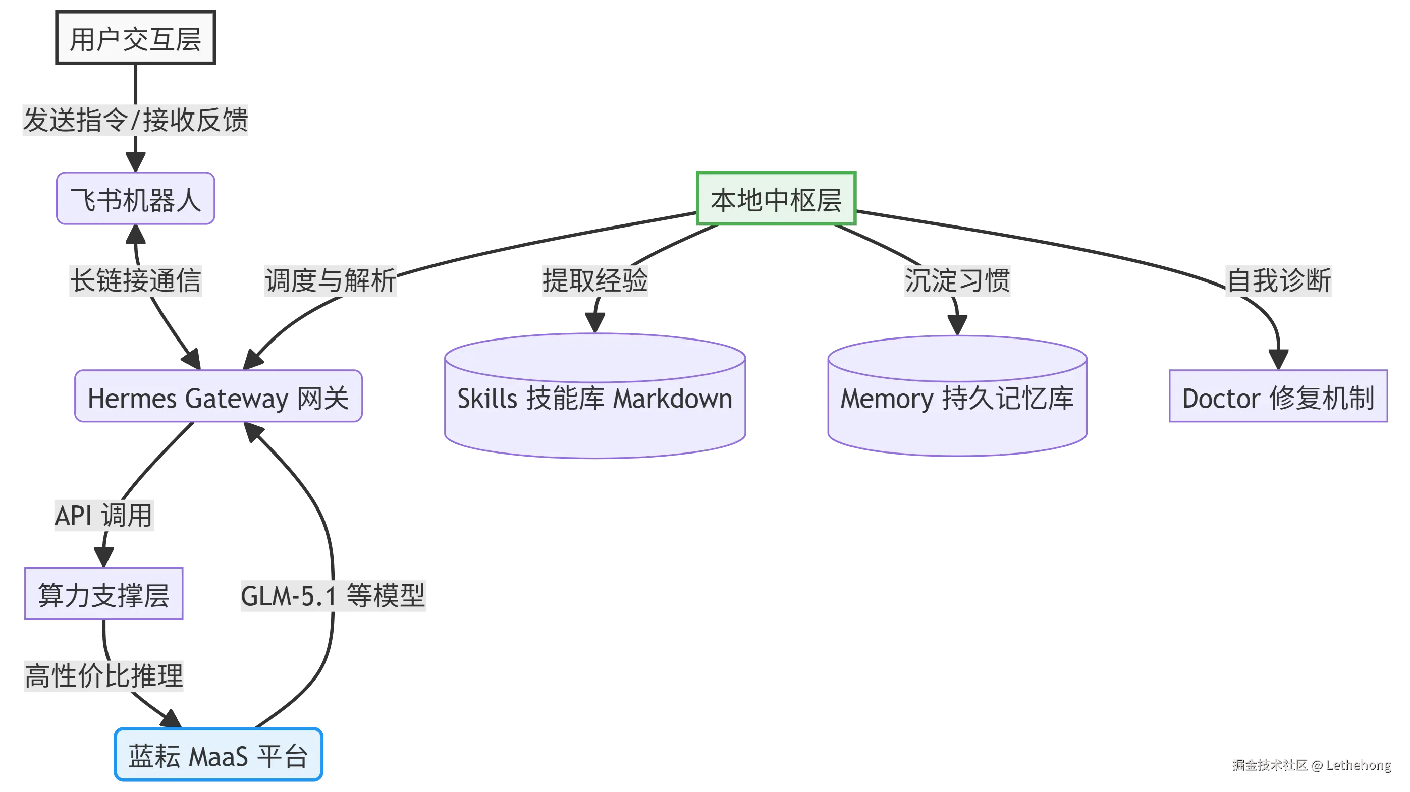 在动手之前,不妨先纵览一下我们将要构筑的完整生态:从底层的系统依赖,到中台的大模型赋能,再到前端的飞书交互,它们如何协同运转。