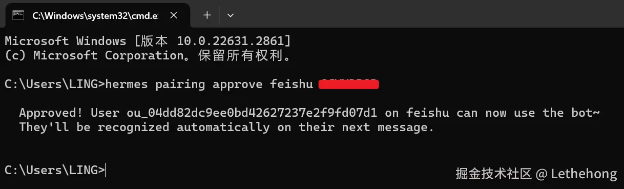uv pip install lark-oapi --python "C:\Users\你的用户名\AppData\Local\hermes\hermes-agent\venv\Scripts"