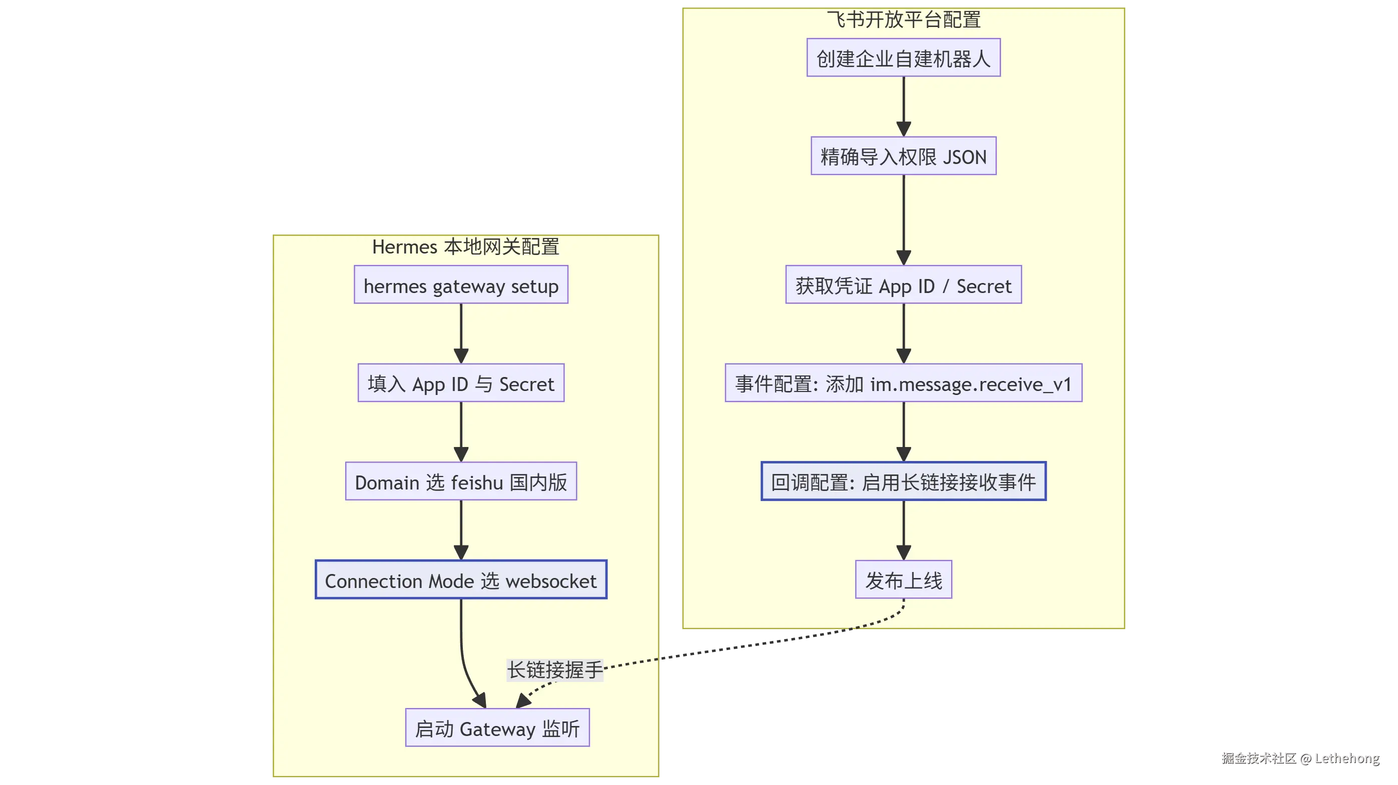 注意:在回调配置中,务必选择“长链接接收事件”。这是一种极其优雅的通信方式,无需你拥有公网 IP 或折腾内网穿透,Hermes 会主动向外建立连接,保持随时待命。