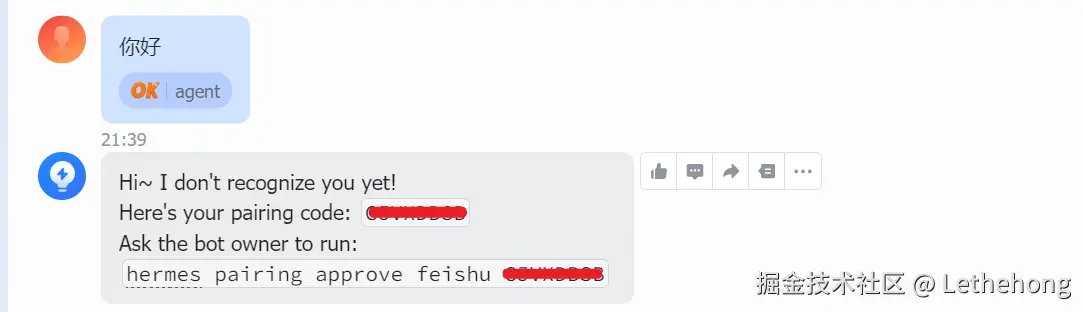 在飞书对话框输入一句简单的问候,若能获得回复,便可跳过此章。但 Windows 原生环境偶尔会有些许水土不服,最典型的便是 lark-oapi 依赖缺失或配置未生效。