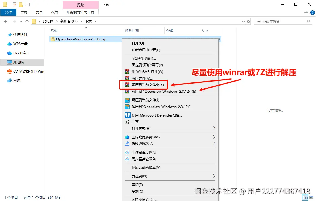 推荐用 WinRAR/7-Zip 解压(避免系统自带解压工具导致文件损坏),右键压缩包选择「解压到当前文件夹」,得到