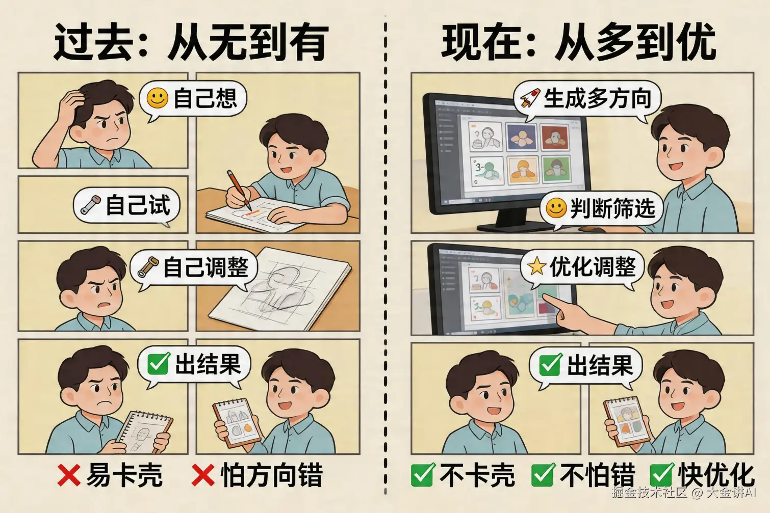 这看起来只是顺序变化,但本质完全不一样。以前你是在“从无到有”,现在你是在“从多到优”。