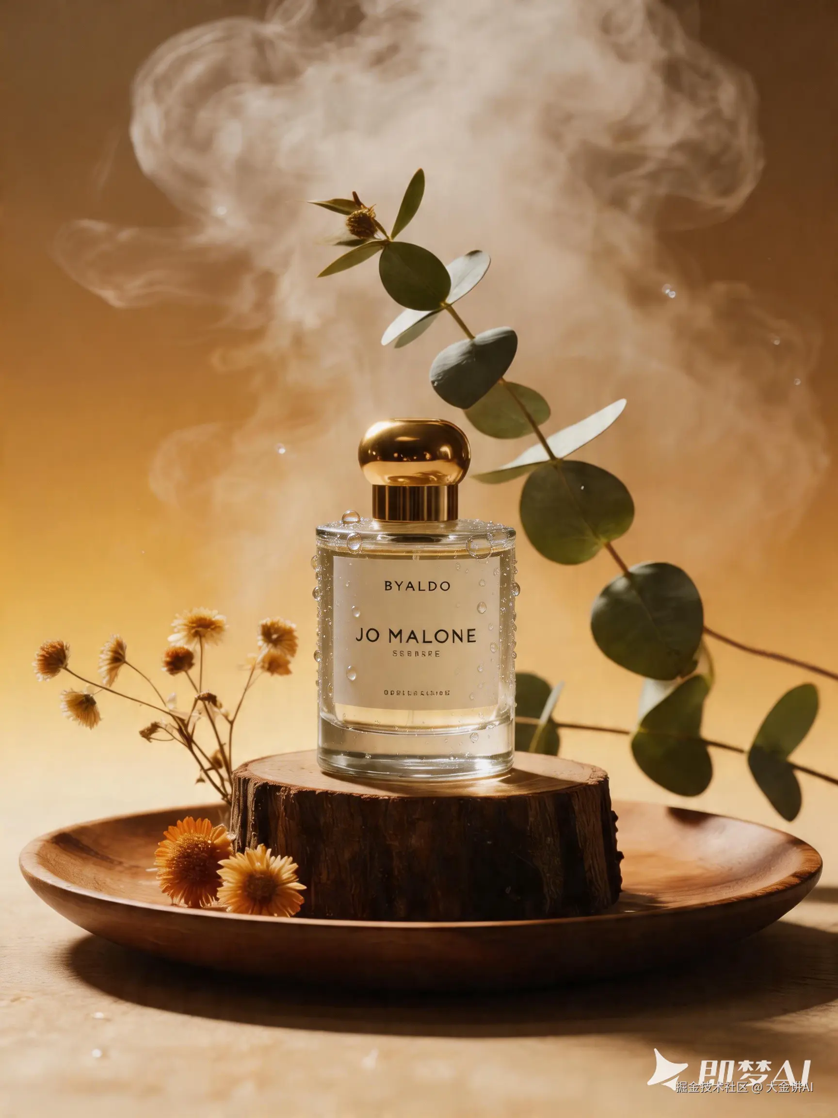 把一瓶鎏金盖透明瓶身的香水立在老橡木托盘上,在晨雾弥漫的氛围中,干花、尤加利枝叶错落环绕,琥珀金到香槟金的暖调低饱和渐变背景,柔焦暗色调,晨露凝结于瓶身,产品工作室用柔光箱打造漫射光线,优雅高级的商业渲染风格,层次丰富的光影过渡,极简主义构图,采用HDRI环境光模拟自然质感,细腻的玻璃反光与金属肌理,创造兼具格调与吸引力的商业摄影画面,使用Cinema4D结合Octane渲染技术,融入Byredo的静谧美学与Jo Malone的英式优雅,捕捉产品的质感与温度。