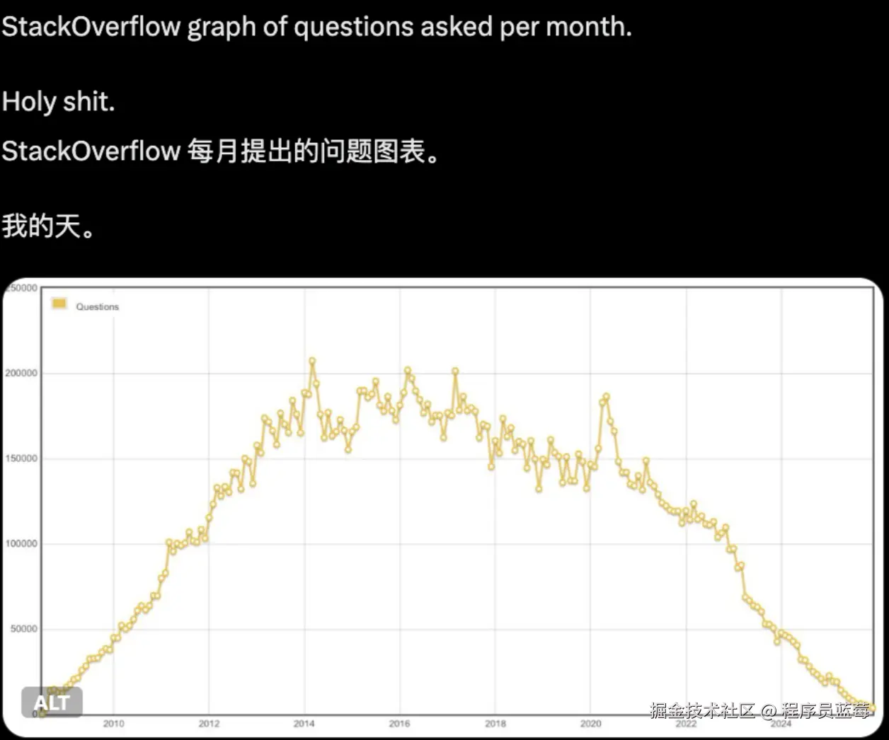 我们先看哪些APP网站会被取代?像Stack Overflow月活只有巅峰的1%,他们之前积累了很多的知识,但是人们会去生产力更高的AI写代码,也就是说知识密集型的网站将被生产力更高的AI工具淘汰。