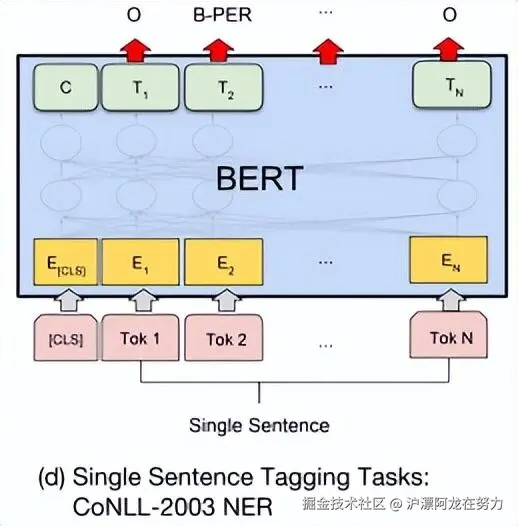 对每个token的输出向量单独进行分类,如判断是否为人名(B-PER)、地名(B-LOC)等。