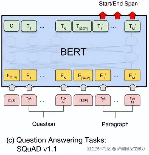 输入格式:[CLS] 问题 [SEP] 段落 [SEP],对每个token分别预测其作为答案起始位置和结束位置的概率。