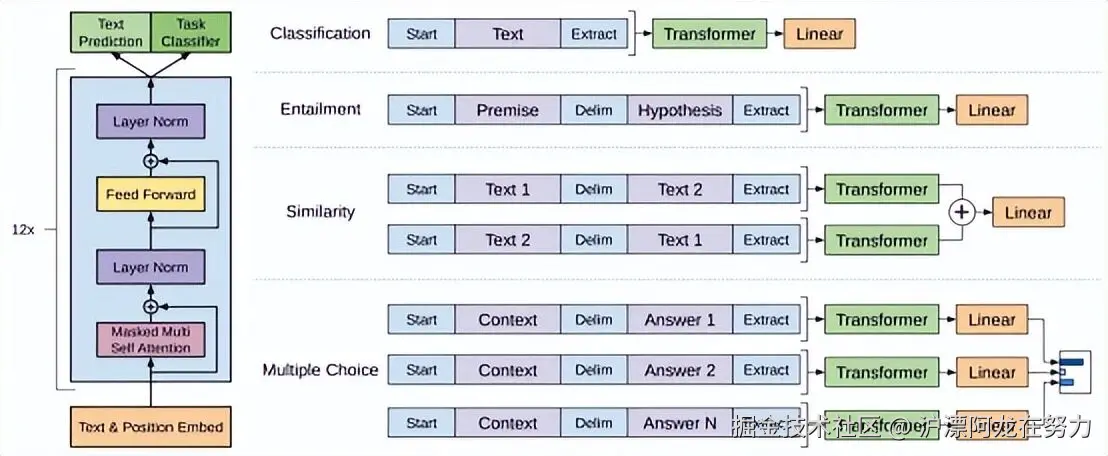 GPT的微调策略极具巧思:在预训练模型顶部添加线性输出层,并将各种下游任务统一转化为文本输入格式。