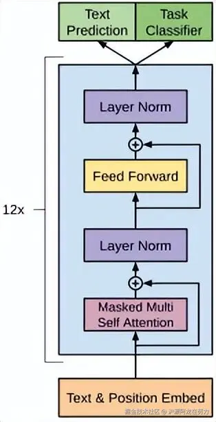 GPT-1采用了12层解码器堆叠,每个解码器层包含掩码多头自注意力(12头)和前馈网络两个子层,模型维度为768。与原始Transformer的一个关键区别在于:GPT-1使用了可学习的位置嵌入(learnable positional embedding) ,而非不可训练的三角函数编码。这意味着模型可以在训练过程中自动优化位置向量。