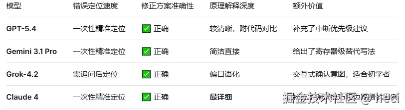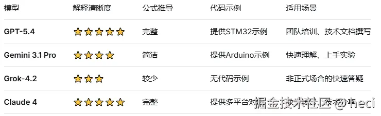 小结:在嵌入式代码调试场景中,Claude 4 的解释最为详尽,适合需要深入理解原理的学习场景;Gemini 最高效,直接给出修正代码;GPT-5.4 的代码风格最贴近工业标准,可直接用于项目集成。