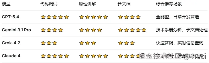 小结:对于需要撰写技术文档或培训新人的工程师,Claude 4 和 GPT-5.4 的解释质量明显更优。Grok 的回答虽然正确但偏口语化,更适合非正式场合的快速答疑。