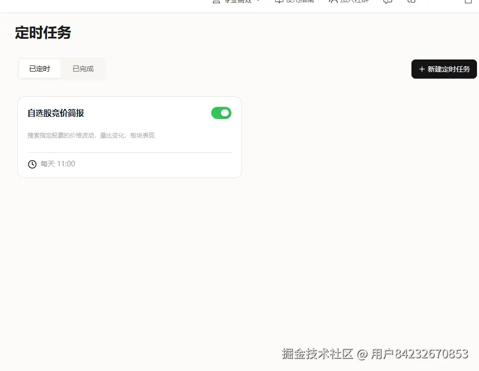 定时任务解放重复劳动:每日行情速览、公告摘要、涨停板复盘,这些固定重复的工作交给定时任务,到点自动推送。以前每天花2小时浏览信息,现在20分钟搞定。