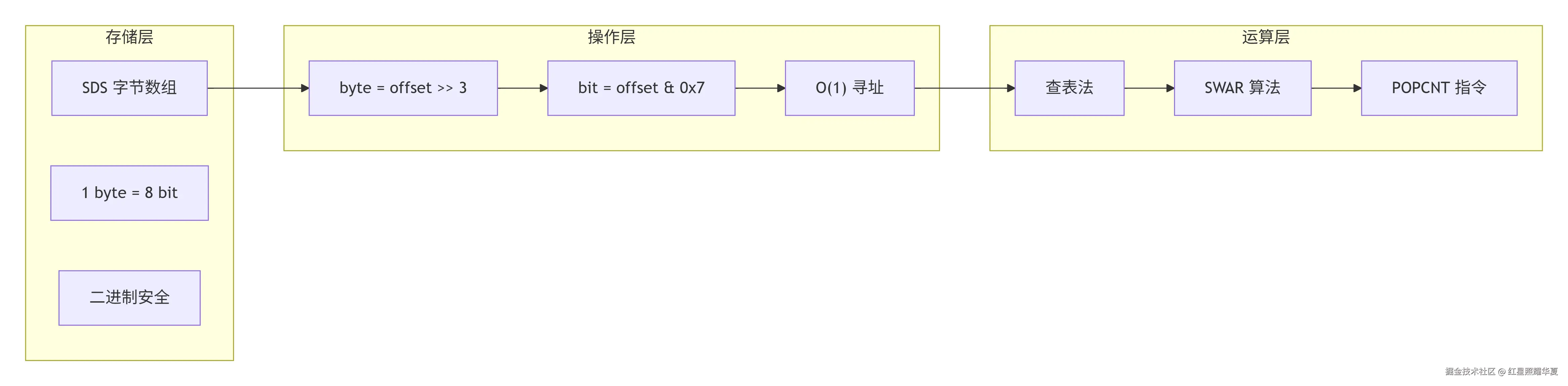 运算层:BITCOUNT 用查表+SWAR+POPCNT 三层加速,BITOP 直接调用 CPU 硬件指令。