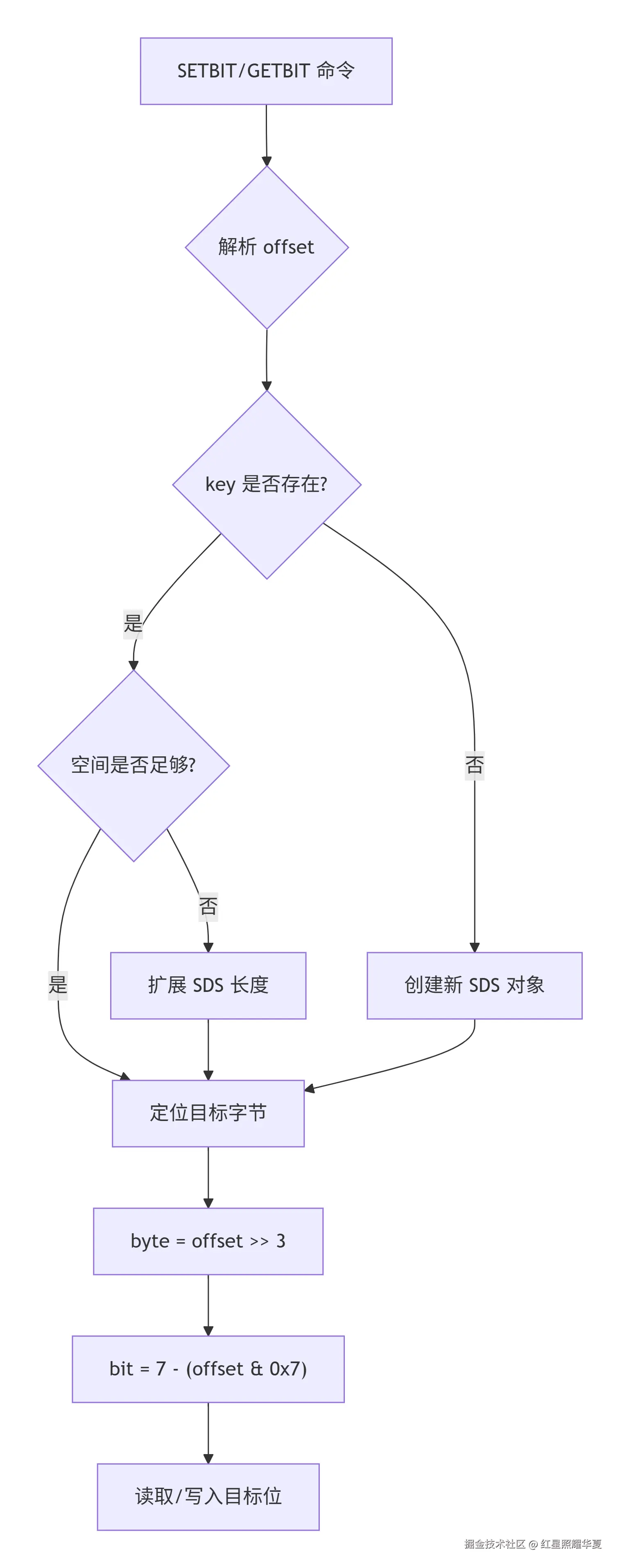 GETBIT 的执行流程几乎是 SETBIT 的子集:定位到字节 → 计算 bit 位置 → 返回 0 或 1。