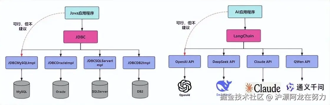 LangChain的本质:LangChain不是要取代LLM,而是成为LLM与现实世界的桥梁。它提供了一套标准化的抽象,让开发者不必从零手搓Agent的基础设施,而是专注于业务逻辑本身。