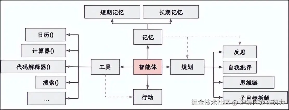 Agent自主规划执行步骤并使用工具来完成任务,形成“用户问题 → LLM → 解析 → 工具调用 → 观察 → LLM → ... → 最终回答”的循环。