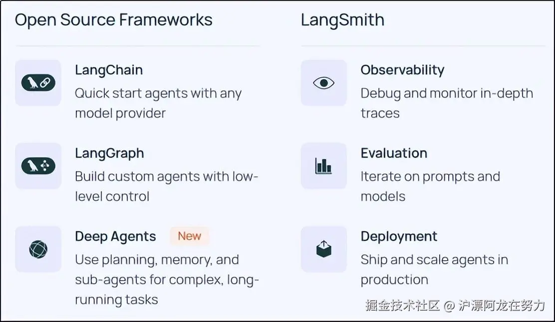 完整的生态系统(LangGraph、LangSmith、Deep Agents)支撑生产级部署