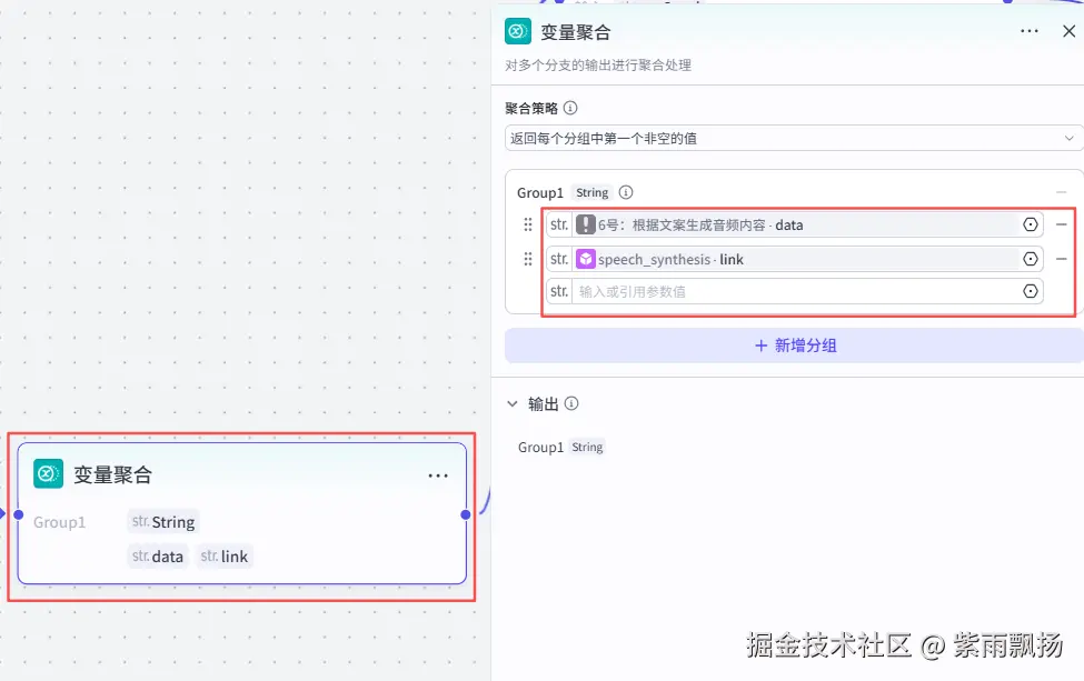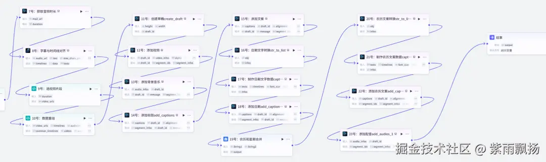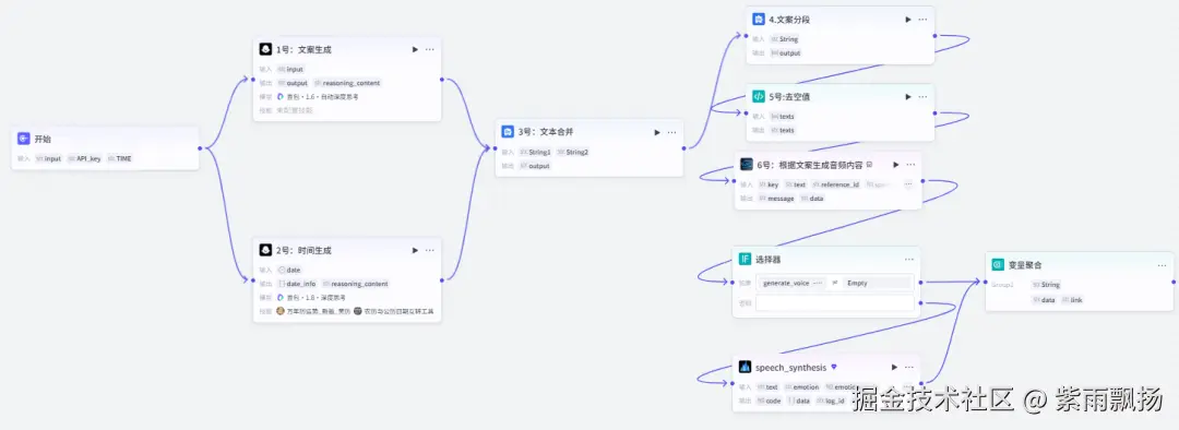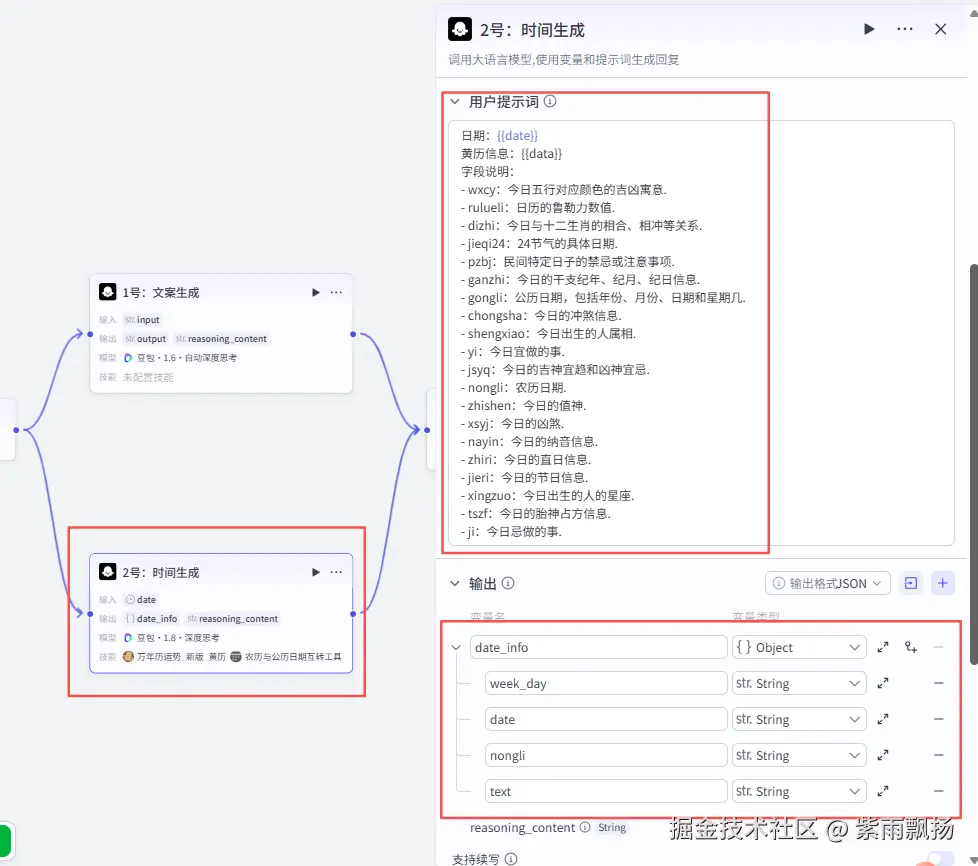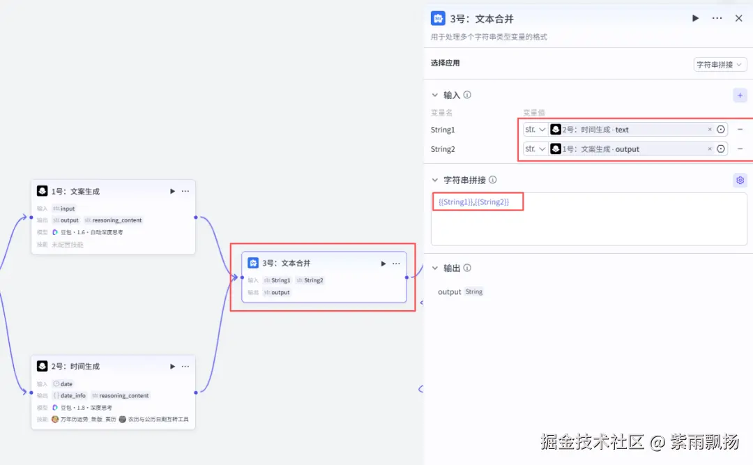 该节点的作用就是将上面生成的文案和时间进行合并。