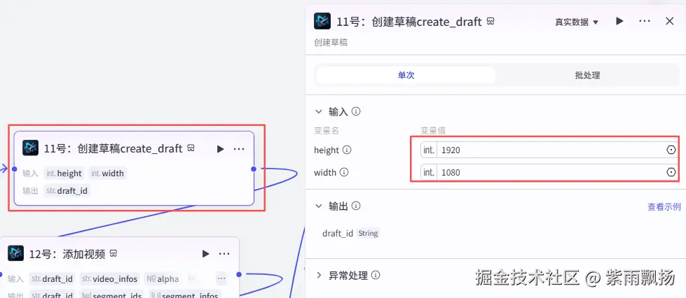 在10号节点后面添加米核的【剪映小助手】的【create_draft】节点->重命名为11号:创建草稿create_draft->设置参数