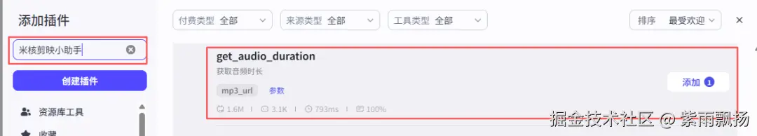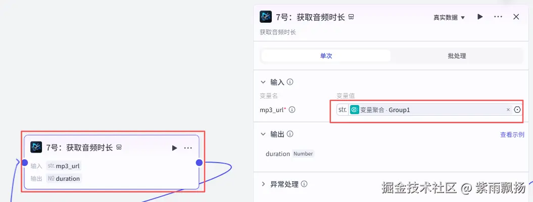 在变量聚合后面添加米核的【剪映小助手】的【get_audio_duration】节点->重命名为7号:获取音频时长->设置参数