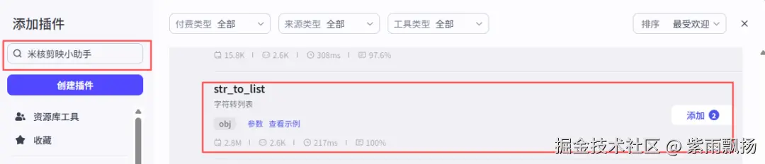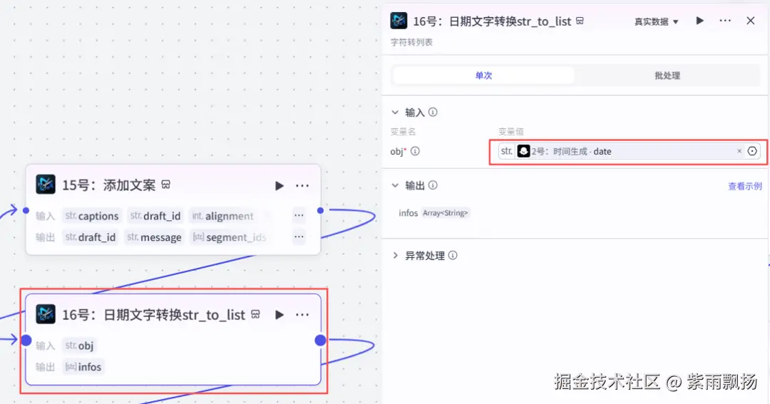 在15号节点后面添加米核的【剪映小助手】的【str_to_list】节点->重命名为16号:日期文字转换str_to_list->设置参数
