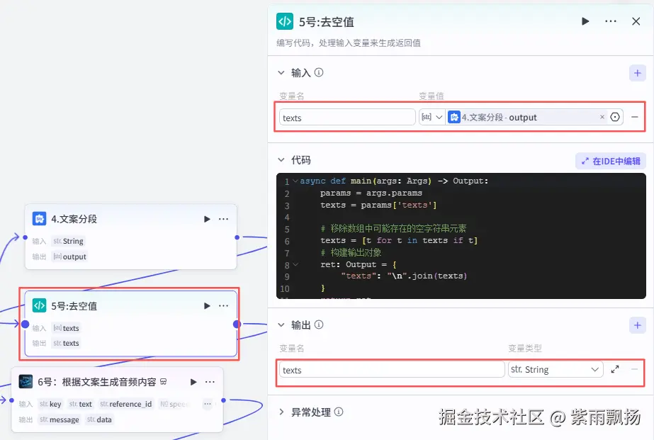 在4号节点后面添加一个扣子官方的【代码】节点->重命名为5号:去空值->设置参数