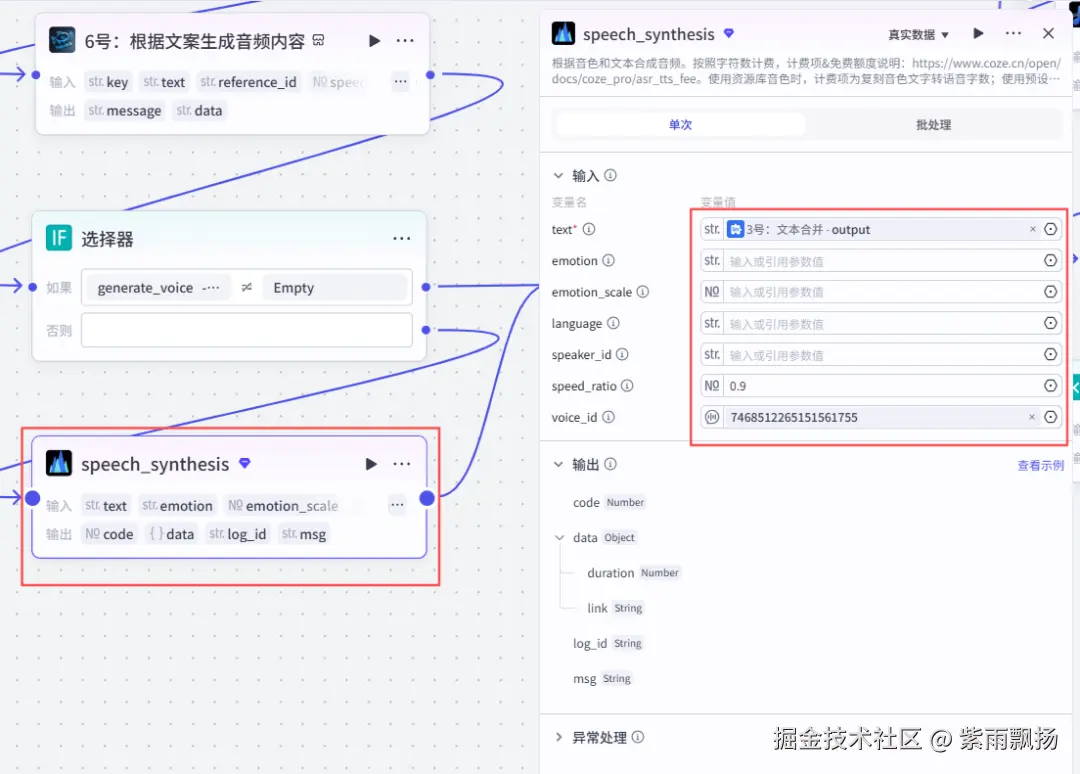 在选择器节点后面添加一个扣子官方的【语音合成】节点->设置参数