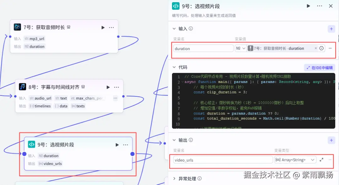 在8号节点后面添加扣子官方的【代码】的节点->重命名为9号:选视频片段->设置参数