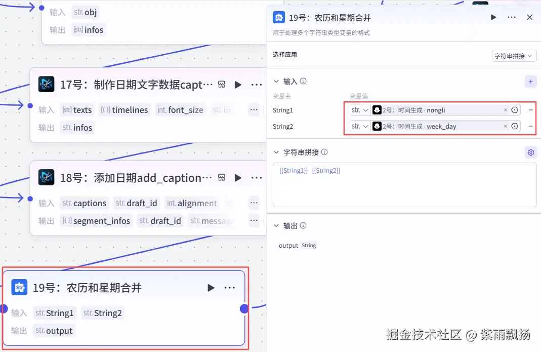 在18号节点后面添加扣子官方的【文本处理】节点->重命名为19号:农历和星期合并->设置参数