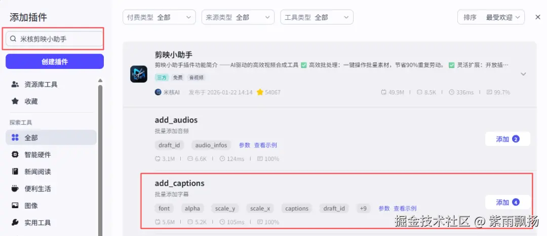 在13号节点后面添加米核的【剪映小助手】的【add_captions】节点->重命名为14号:添加标题add_captions->设置参数
