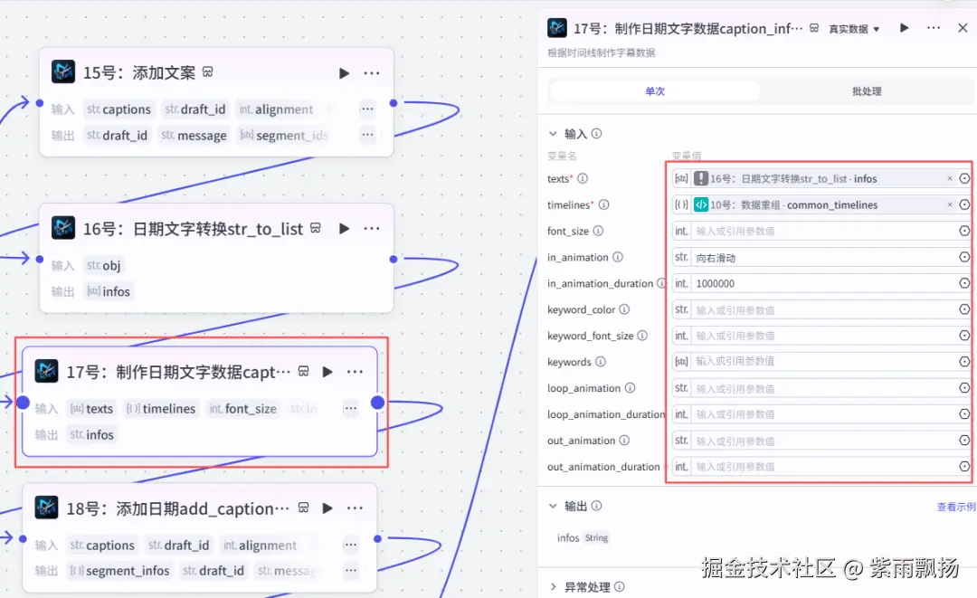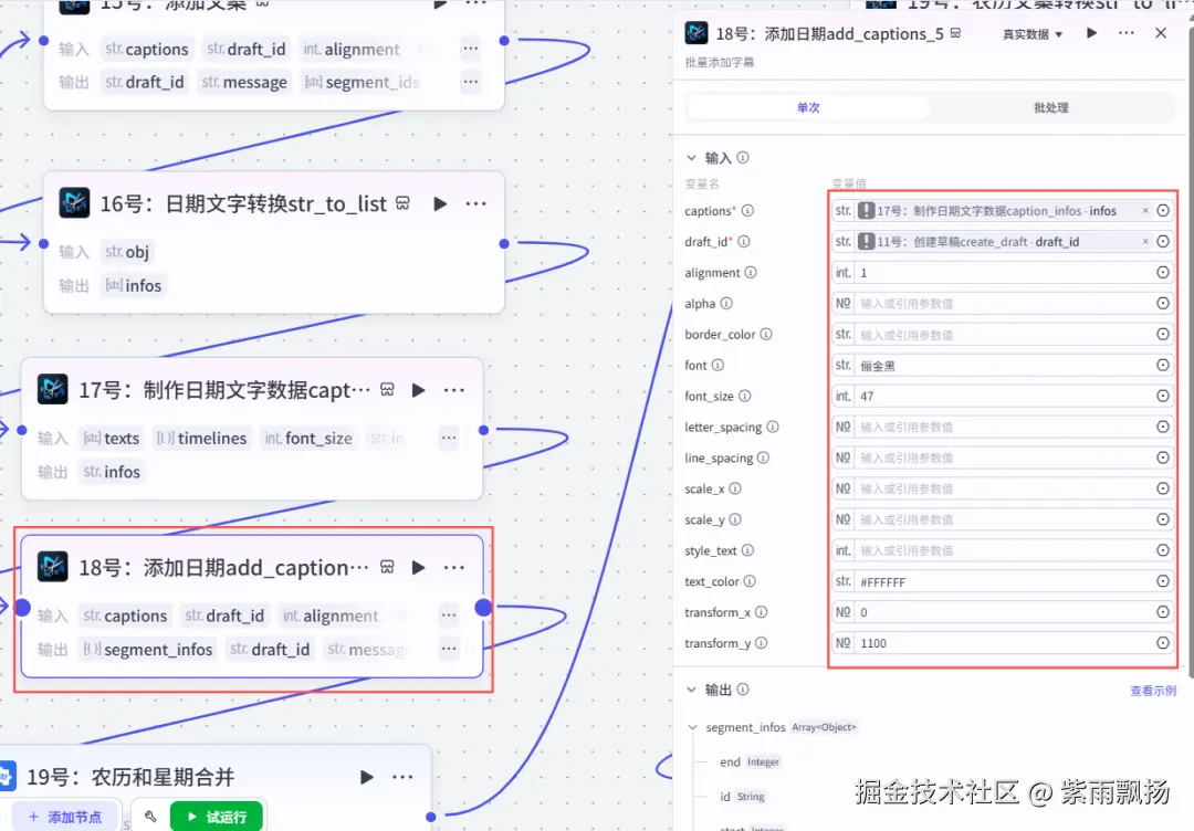 在16号节点后面添加米核的【剪映小助手】的【captions_infos】节点->重命名为17号:制作日期文字数据caption_infos->设置参数