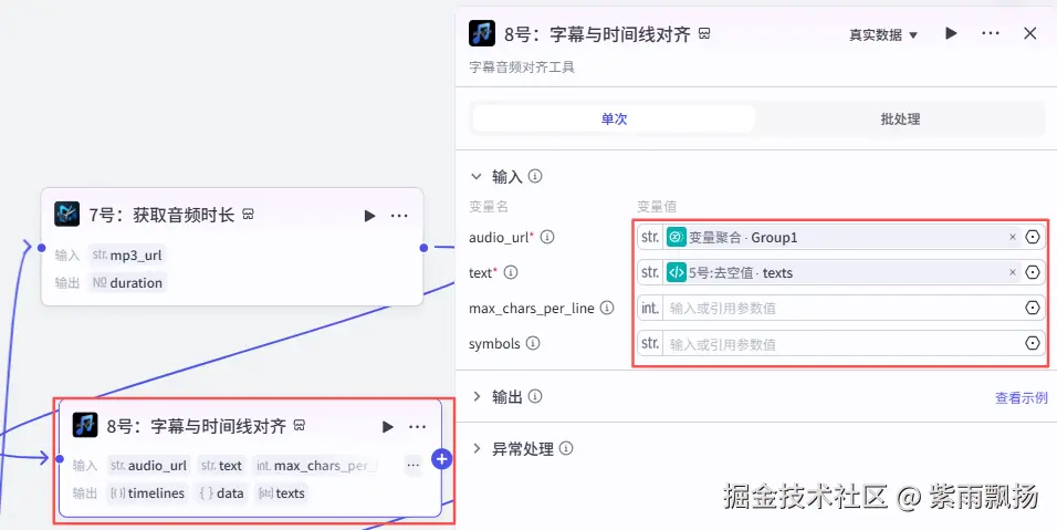 在获取音频时长后面添加米核的【字幕音频对齐】的【align_text_to_audio】节点->重命名为8号:字幕与时间线对齐->设置参数