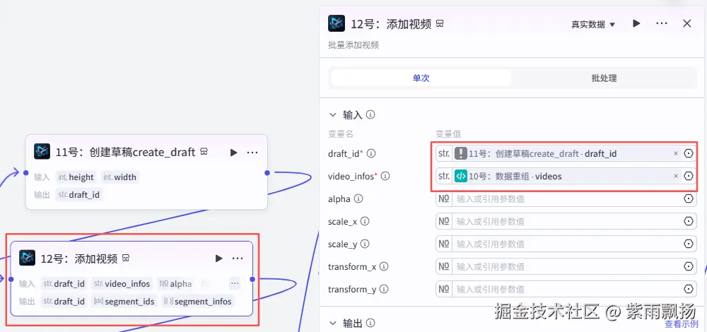 在11号节点后面添加米核的【剪映小助手】的【add_videos】节点->重命名为12号:添加视频->设置参数