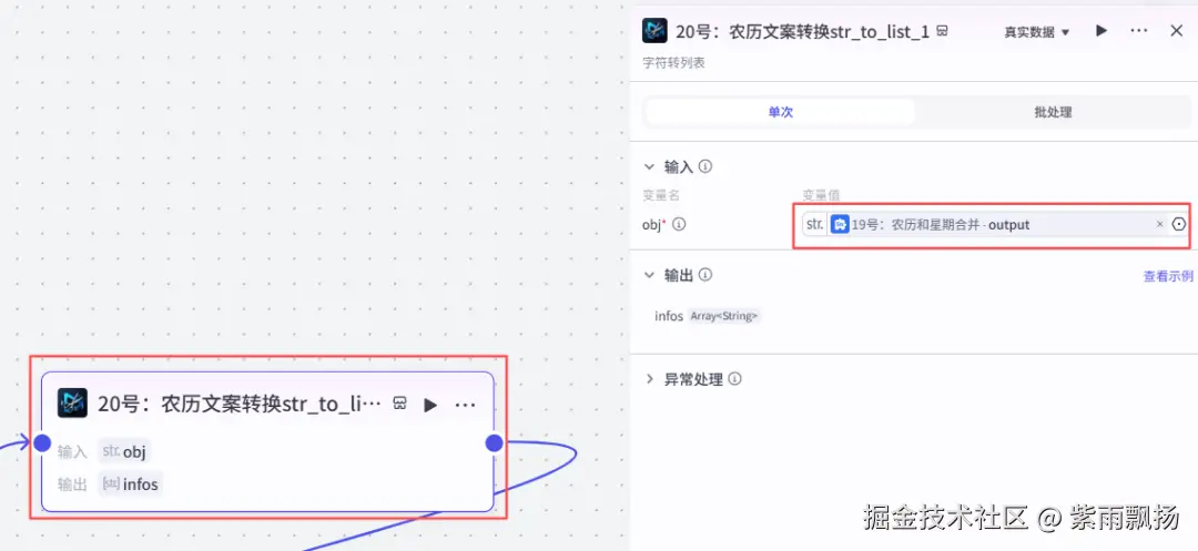 在19号节点后面添加扣子米核的【剪映小助手】的【str_to_list】节点->重命名为20号:农历文案转换str_to_list_1->设置参数