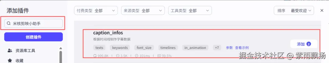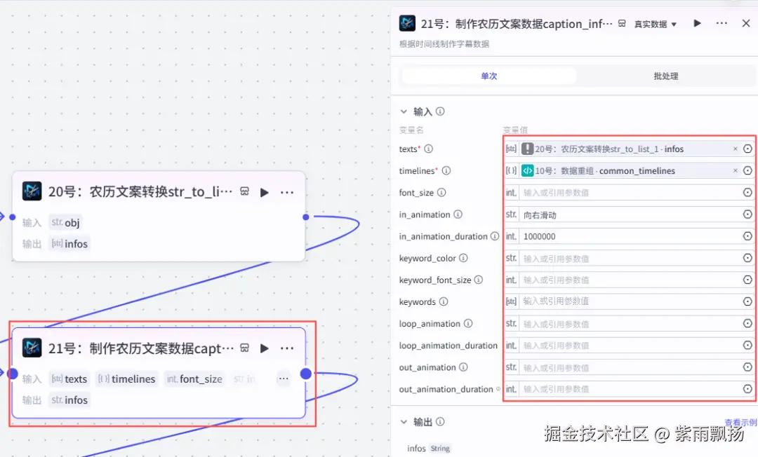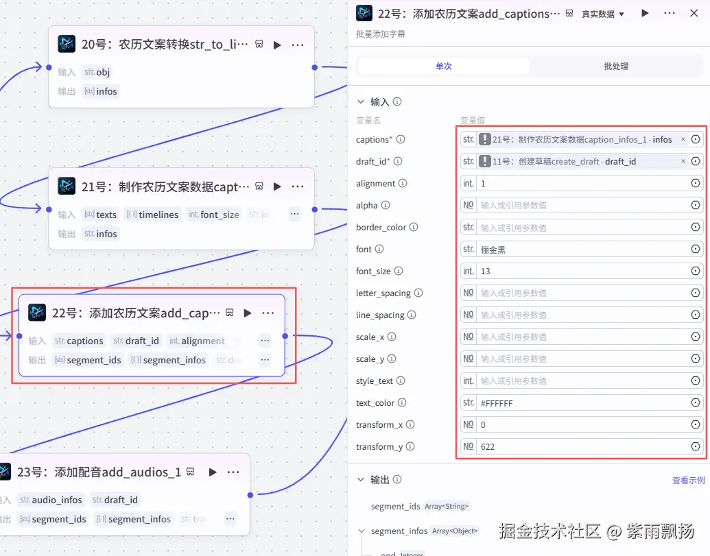 在20号节点后面添加扣子米核的【剪映小助手】的【caption_infos】节点->重命名为21号:制作农历文案数据caption_infoscaption_infos->设置参数