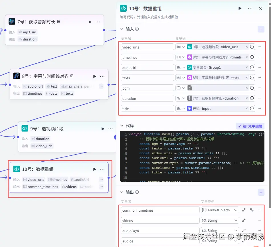 在9号节点后面添加扣子官方的【代码】的节点->重命名为10号:选数据重组->设置参数