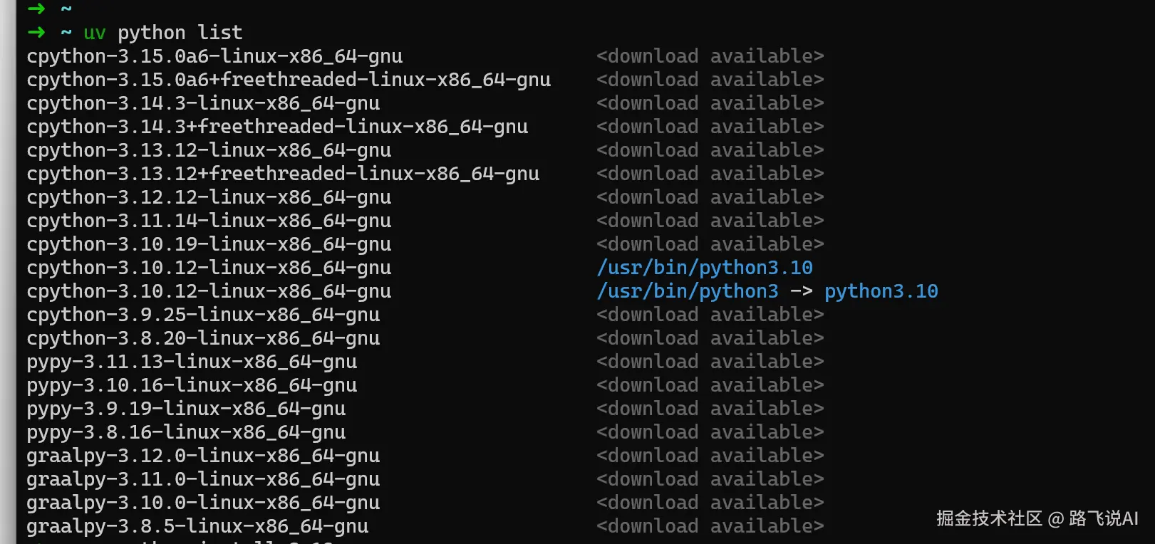 uv python list能列出版本。mkdir test && cd test && uv init && uv run hello.py能成功运行。