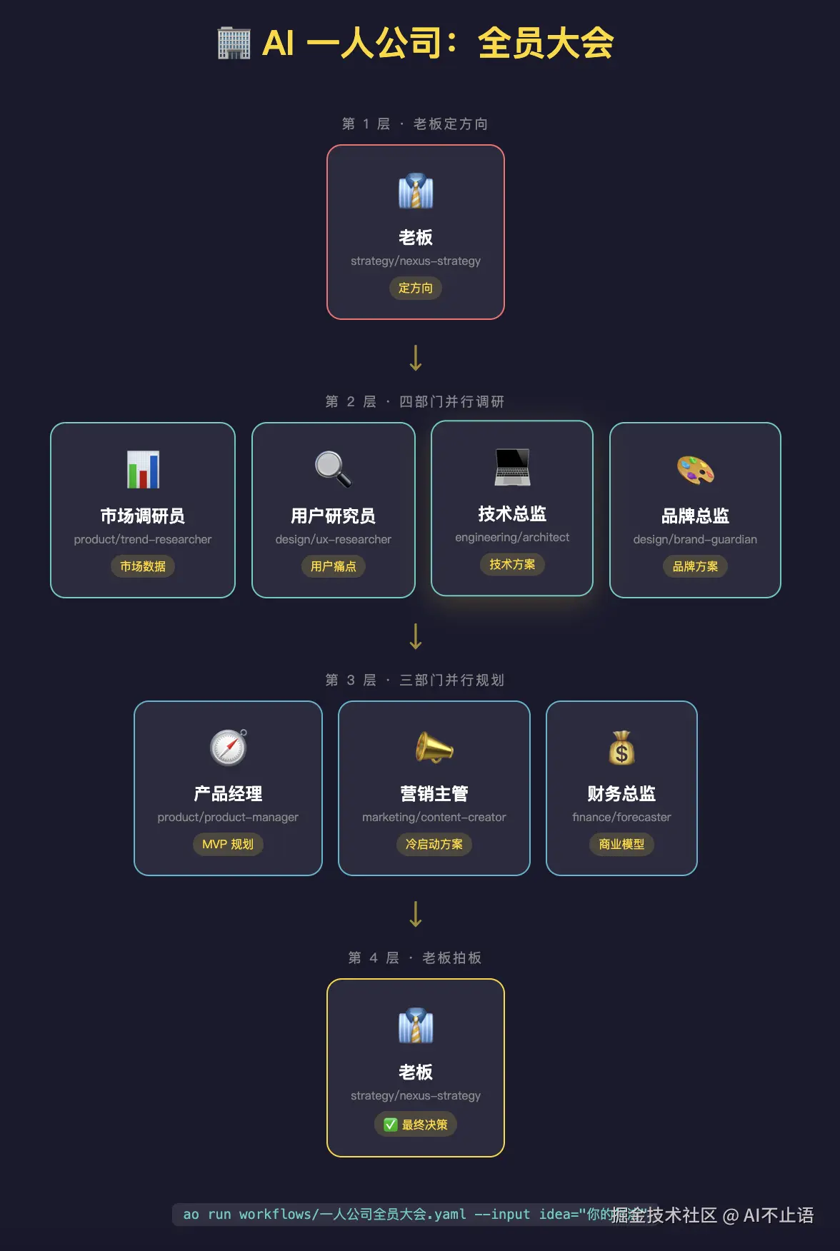 ao run workflows/一人公司全员大会.yaml --input idea="帮打工人用AI写简历和模拟面试的求职神器"
