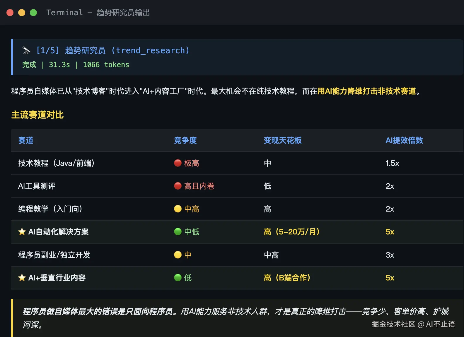 🔭 趋势研究员 —— 分析了 6 个赛道的竞争度、变现天花板和 AI 提效倍数