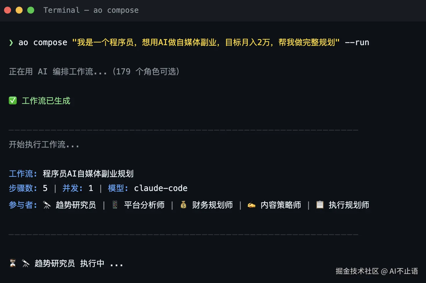ao compose "我是一个程序员,想用AI做自媒体副业,目标月入2万,帮我做完整规划" --run