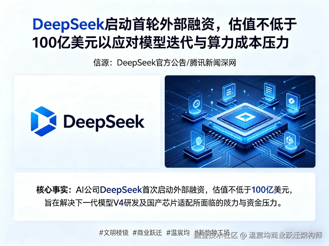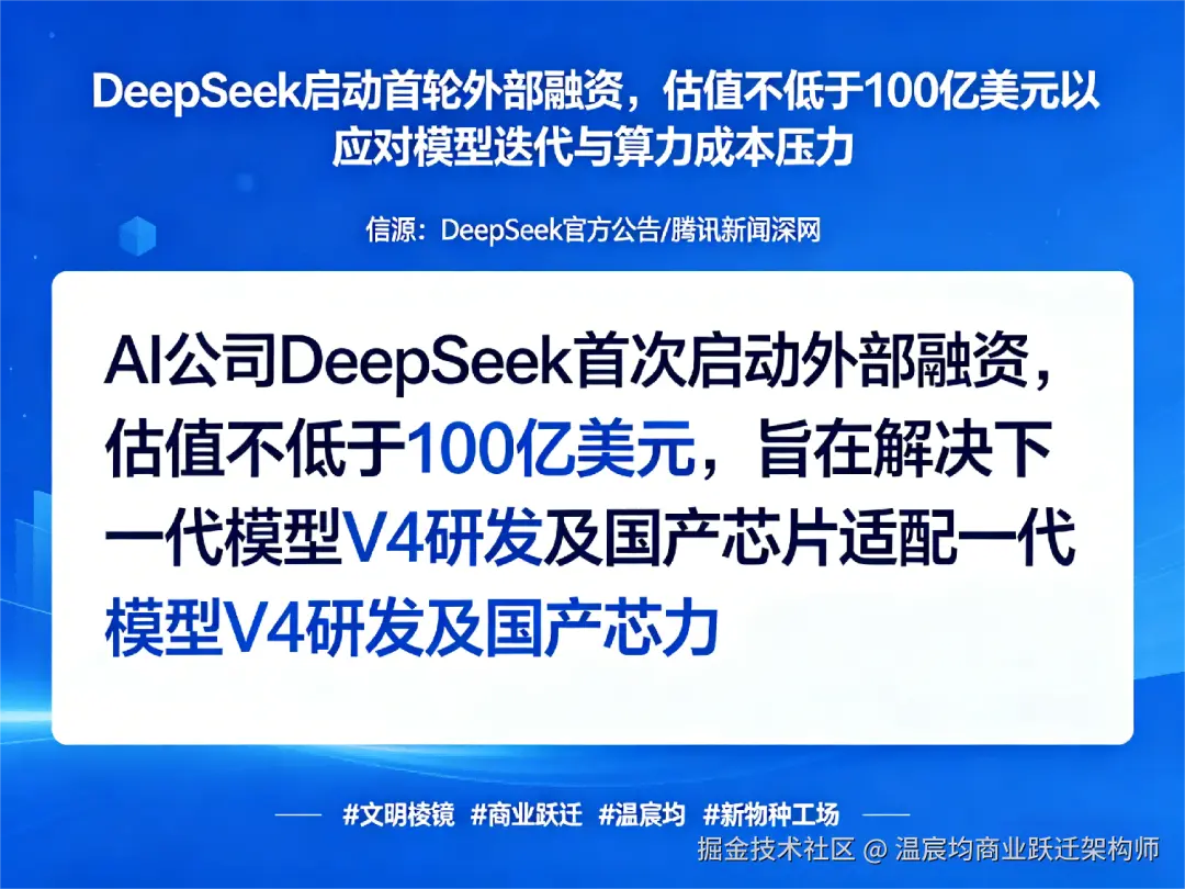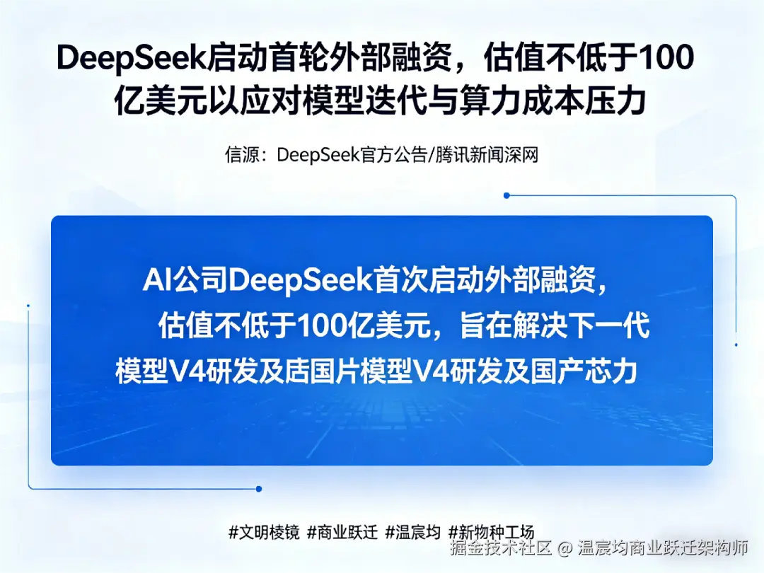 但一个更本质的问题随之浮现:为什么是现在?为什么DeepSeek选择在此时,以如此高的估值门槛,打开资本的大门? 这绝非简单的“缺钱求生存”,而是一次精心策划的战略动作,其背后折射出全球AI竞赛的游戏规则正在发生根本性变迁。本文将从“商业跃迁”的视角,为你拆解这场百亿融资背后,一场从“技术闪电战”转向“体系持久战”的深层逻辑重构。