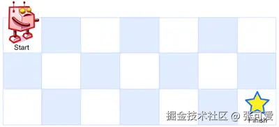 机器人每次只能向下或者向右移动一步。机器人试图达到网格的右下角(在下图中标记为 “Finish” )。