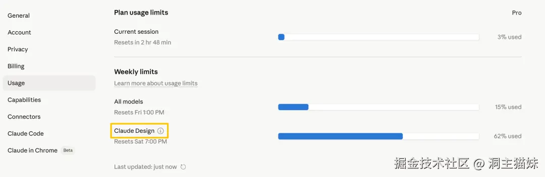 官方的说法是:基于新发布的型号Opus4.7,面向Pro、Max、Team和Enterprise订阅用户访问,我现在是Pro版本,使用额度多了一个Claude Design的额度开放。