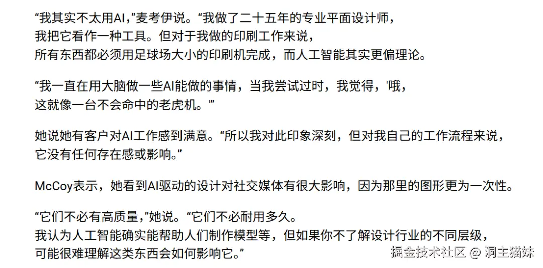 当然我们的设计师们也不要太焦虑,就像有着25年经验的平面设计师在接受采访时曾表示:“她其实并没有真正使用过人工智能工具。”