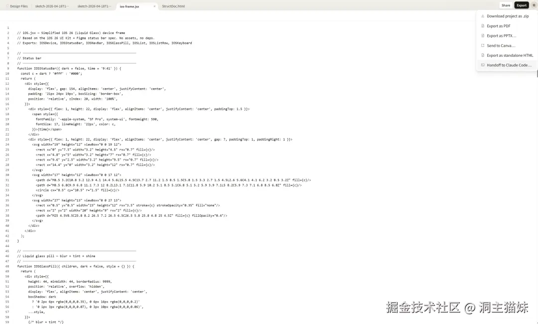 做完之后,还可以导出ZIP、PDF、PPTX和HTML,甚至可以直接交给Claude Code 接入开发流程。