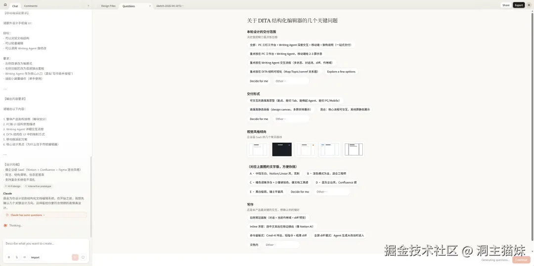 传统的 AI 设计工具,逻辑是「你来画,AI 帮你快一点」;Claude Design 的逻辑反过来了,AI 是主要的生成者,你是过程的审阅者。