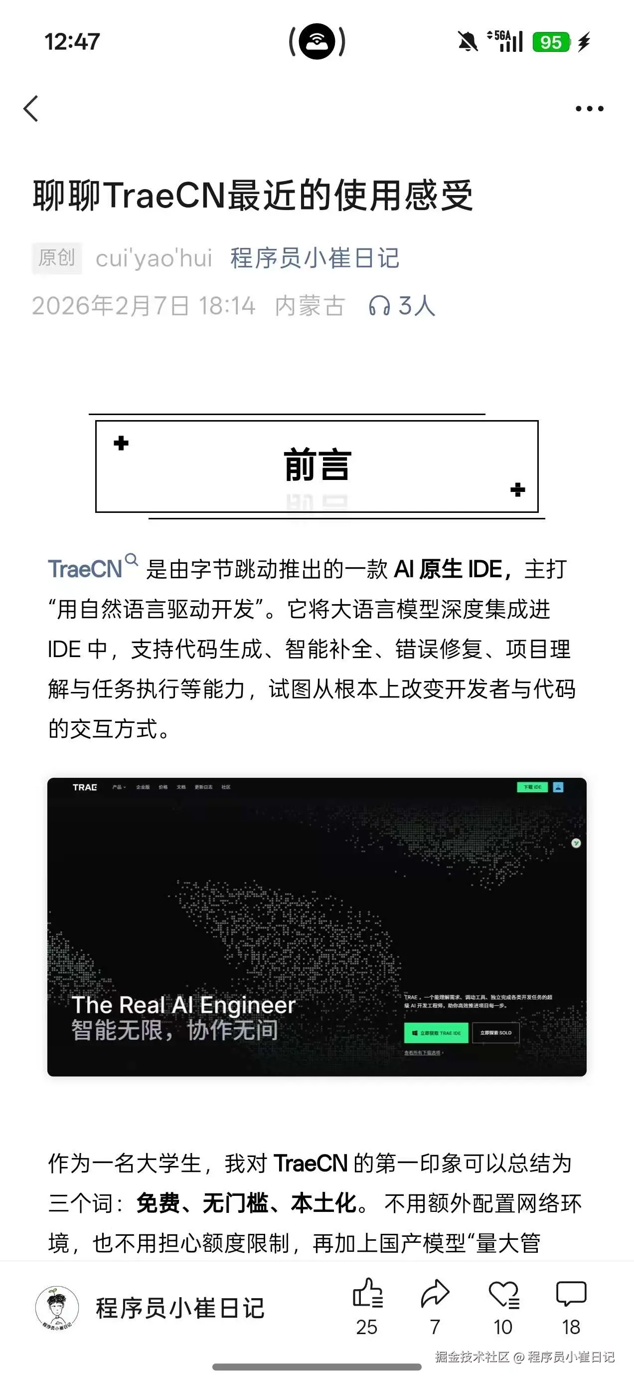 今年2月,我在多个平台创建了这个账号“程序员小崔日记”。2月7号,发了第一篇文章,写的是我用TraeCN做一个小游戏的使用感受。