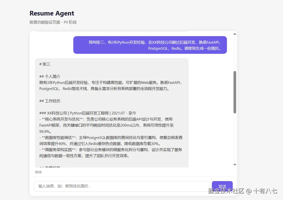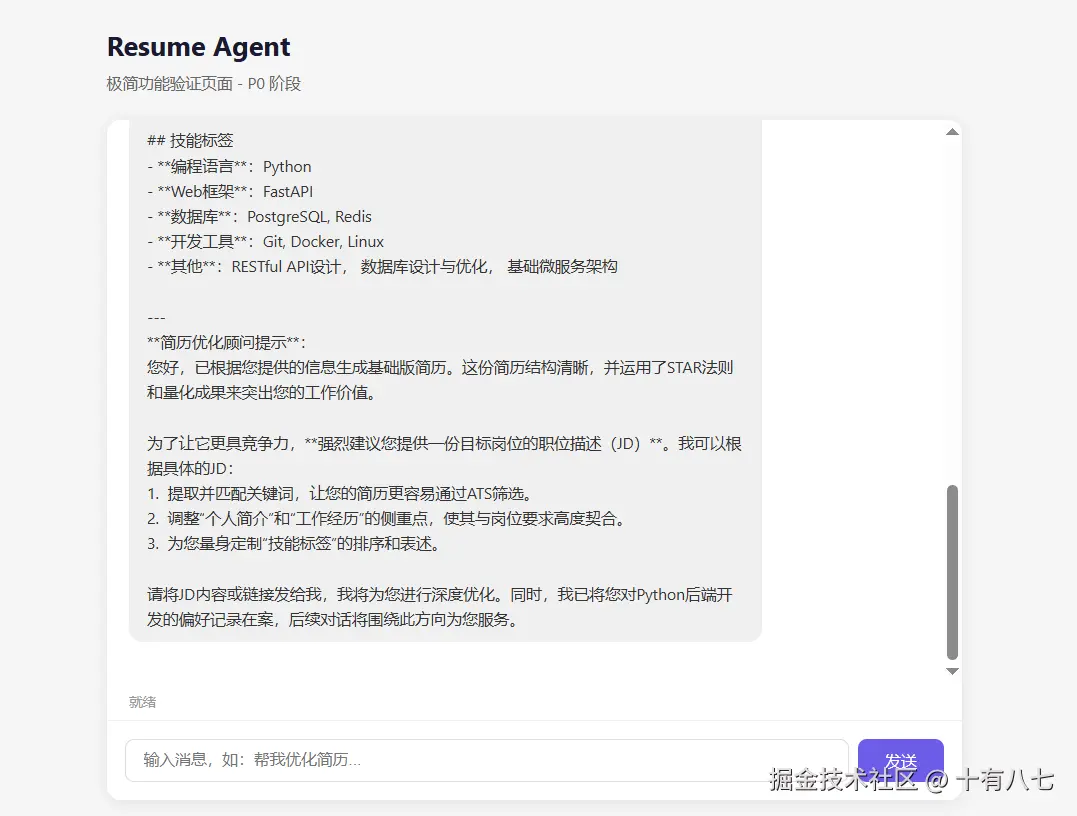 通过"角色提示词 + 用户记忆 + 领域 Skill"三层组装的系统提示词,LLM 能否稳定输出结构化的 Markdown 简历?记忆系统能否实现"越用越好用"?